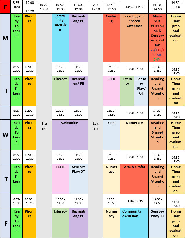 This timetable is an example of a typical week for one class. Activities and timings may vary between weeks and between different classes.